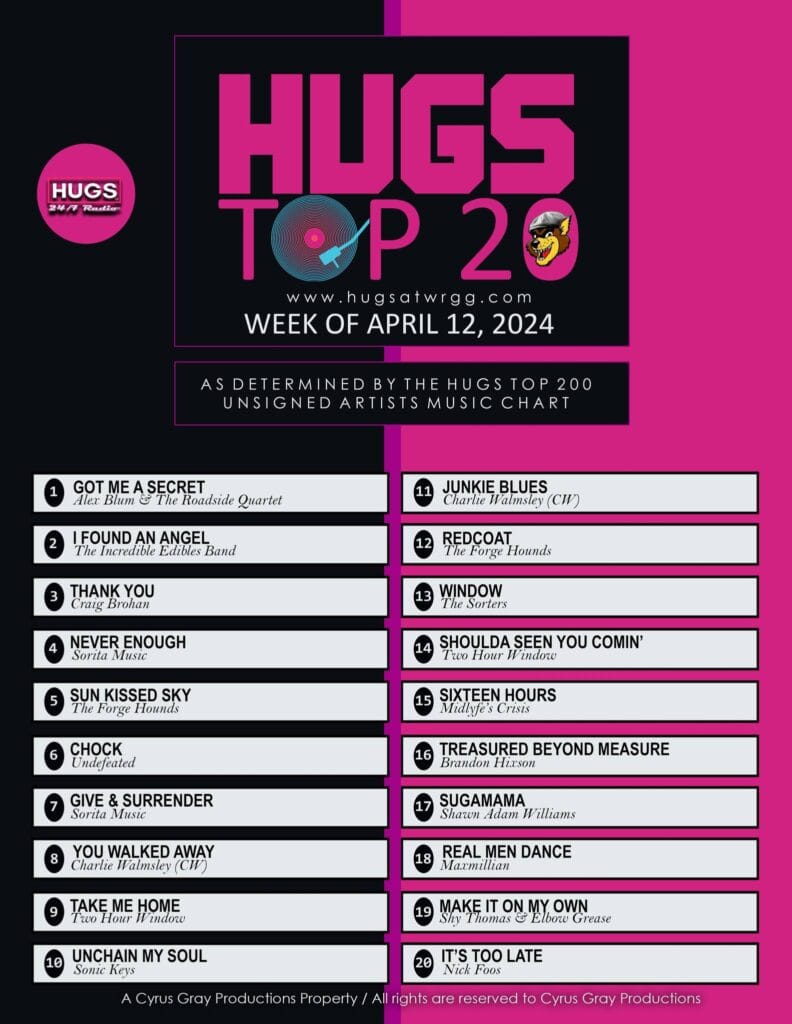 Nice One!! Super to see Forge Hounds “Sun Kissed Sky” at Number 5 and “Redcoat” at Number 12 in this weeks Hugs At Wrgg, USA, Unsigned Artists Top 200 Charts…. Thank You for your great support!!