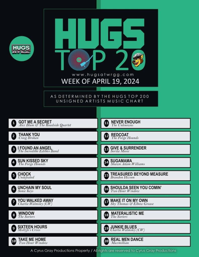 Super Duper !!!! Great to see Forge Hounds “Sun Kissed Sky” moving to Number 4, in this weeks Hugs At Wrgg, USA Unsigned Artists Chart Top 200, and also to see “Redcoat at Number 12. Thank you for all your great support